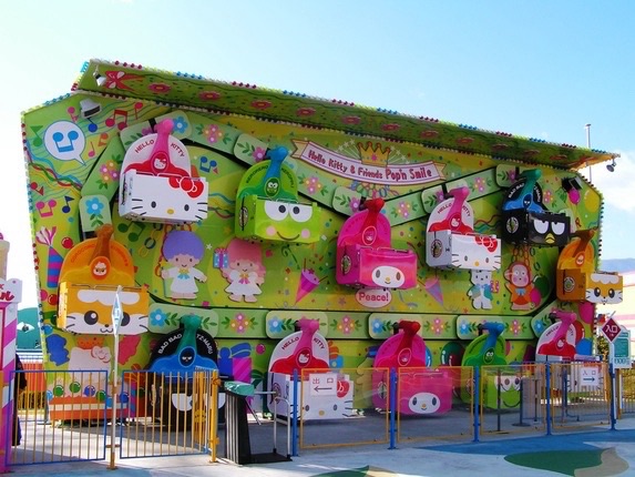 サンリオキャラクターのトートバッグのような形をしたゴンドラで、フワフワと周遊。その形状はどこか、昭和のクイズ番組を彷彿とさせます。