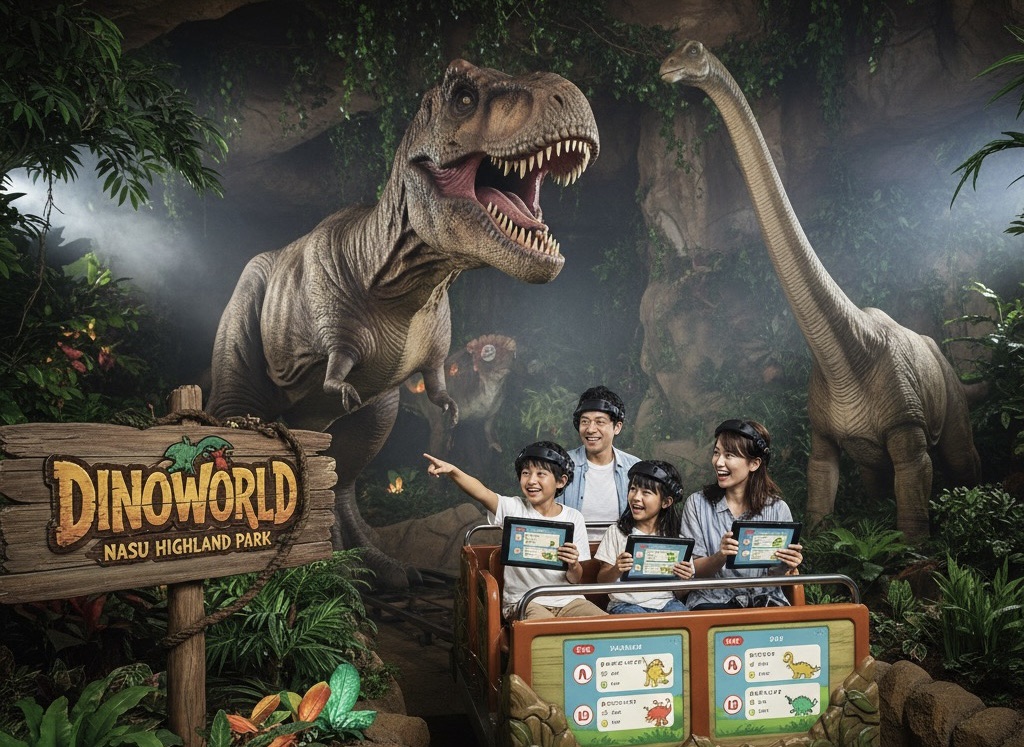 恐竜の生息する世界をトロッコのような乗り物に乗って探検し、前面に設置されたタブレットから出題される恐竜クイズに挑戦して “恐竜王”を目指します。