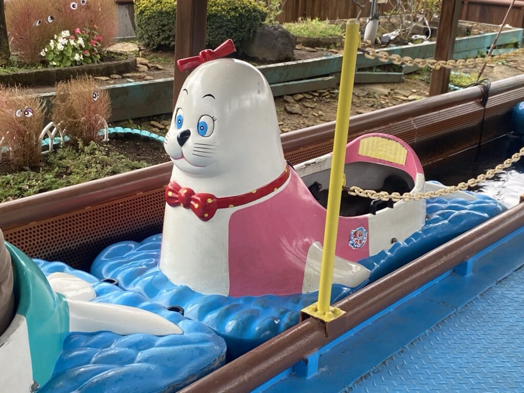 アザラシかな?かわいい乗り物に乗って、水路を一周してきます。